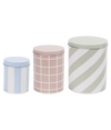 Dieses 3teilige Dosenset ist ideal als Aufbewahrungselement für Küche, Bad, Kinderzimmer oder Hobby. Jede der Dosen ist anders grafisch gemustert und sehen einzeln oder nebeneinander immer top aus.